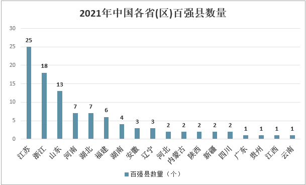 中國縣域經濟的區域發展極不平衡。2021年,江蘇省、浙江省、山東省三省表現搶眼,百強縣數量分別為25個、18個和13個;黑龍江省、吉林省、山西省、甘肅省、青海省、寧夏回族自治區、重慶市、西藏自治區、廣西壯族自治區、海南省等10省(區)縣域均無百強縣。2021年中國各省(區)百強縣數量
