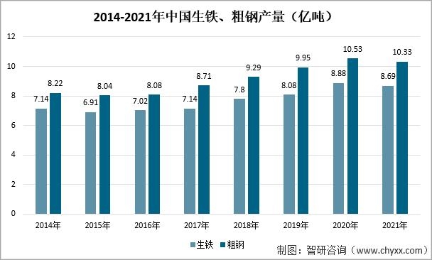 2014-2021年中國生鐵、粗鋼產量(億噸)