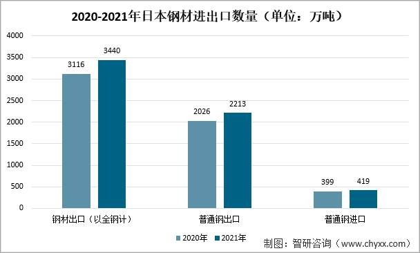2021年日本鋼材實際出口記錄(以全鋼計)為3440萬噸,比上年增長7.0%,為八年來首次增長。普通鋼材用量2213萬噸,比上年增長5.8%,為6年來首次增長。2021年日本進口普通鋼材419萬噸,比上年增長5.2%,為兩年來首次增長。