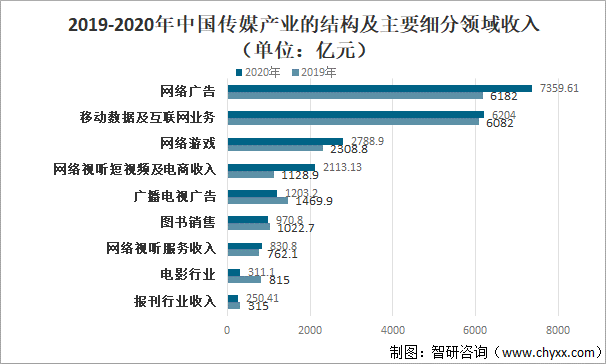 2019-2020年中國傳媒產業的結構及主要細分領域收入(單位:億元)