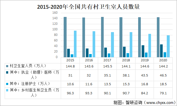 2020年,全國(guó)村衛(wèi)生室人員達(dá)144.2萬(wàn)人,比上年減少0.4萬(wàn)人,其中,執(zhí)業(yè)(助理)醫(yī)師46.5萬(wàn)人,占村衛(wèi)生室人員的32.25%;注冊(cè)護(hù)士18.5萬(wàn)人,占村衛(wèi)生室人員的12.83%;鄉(xiāng)村醫(yī)生和衛(wèi)生員79.1萬(wàn)人,占村衛(wèi)生室人員的54.85%。