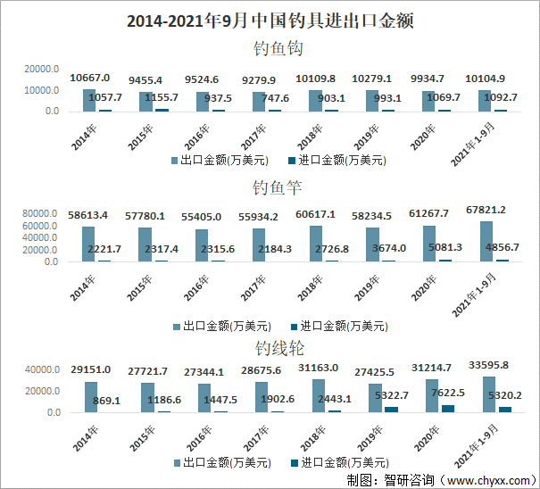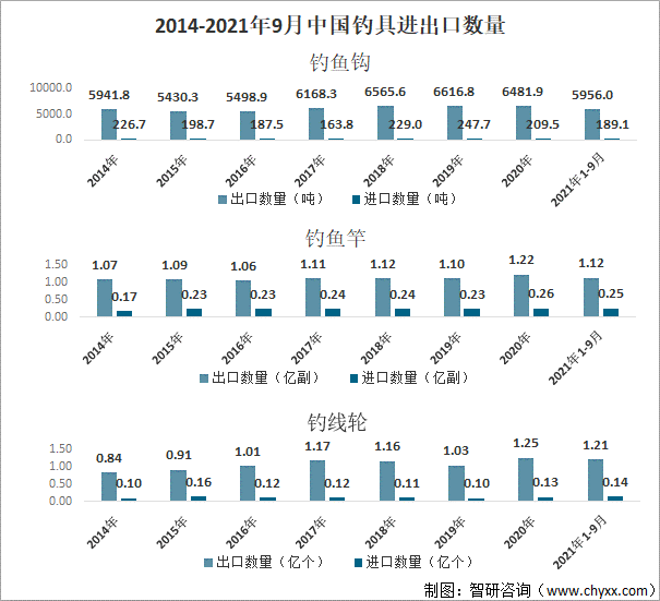 從中國釣具進出口情況來看,中國是釣具出口大國,出口總額占世界釣具出口總額的70%。2021年前三季度中國釣魚鉤、釣魚竿、釣線輪出口數(shù)量依次為5956.0噸、1.12億副、1.21億個;進口數(shù)量依次為189.1噸、0.25億副、0.14億個。