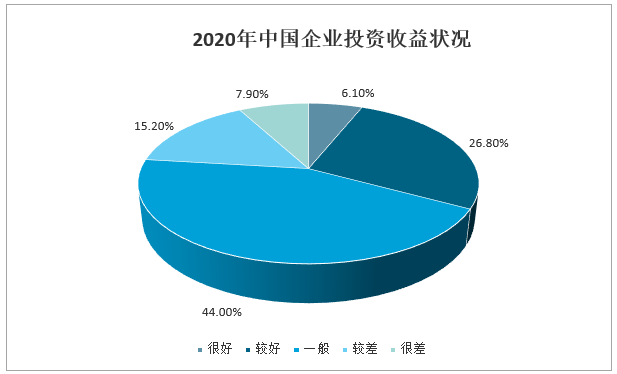 2020年,受新冠肺炎疫情等因素的影響,近76.9%的企業(yè)收益在“一般”及以上水平,低于2019年90.2%的水平,三成以上企業(yè)收益狀況維持在較好及以上(32.8%)。其中營(yíng)業(yè)收入提高10%以上的企業(yè)占比為6.1%,大幅低于2019同期水平﹔收益“一般”(營(yíng)收增幅為1%—5%)的企業(yè)占比最大,為44.0%,與2019年相比略有上升﹔營(yíng)業(yè)收入減少的企業(yè)占比23.8%,較2019年顯著增加,其中,營(yíng)業(yè)收入降幅超過(guò)10%的企業(yè)占7.9%,降幅在5%以?xún)?nèi)的企業(yè)占15.2%。2020年中國(guó)企業(yè)投資收益狀況