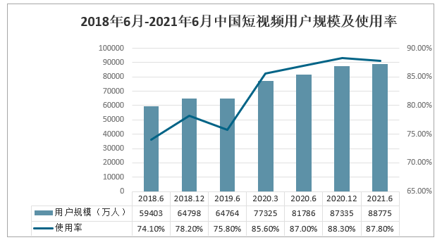 2018年6月-2021年6月中國短視頻用戶規模及使用率