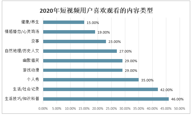 短視頻平臺內容多元匹配用戶需求,生活、放松、信息獲取是用戶喜好的底色。2020年,生活技巧/知識科普、生活/社會記錄、個人秀為短視頻用戶最喜歡的TOP3類型,“放松休閑”和“獲取信息”仍是用戶看短視頻的強驅動。2020年短視頻用戶喜歡觀看的內容類型