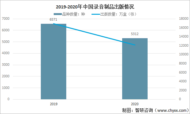 2020年中國共出版錄音制品5312種,較2019年減少了1259種,同比減少19.16%,出版數量共計12194.67萬盒(張),較2019年減少了4737.26萬盒(張),同比減少27.98%。
