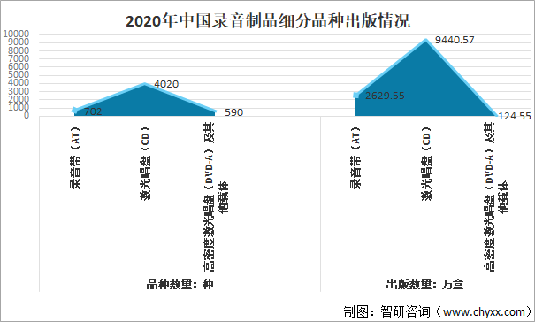 從細分品種來看,2020年中國共出版錄音帶(AT)702種,出版數量共計2629.55萬盒;激光唱盤(CD)4020種,出版數量共計9440.57萬盒;高密度激光唱盤(DVD-A)及其他載體590種,出版數量共計124.55萬盒。