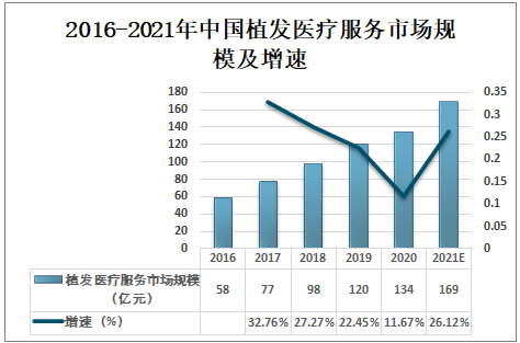 2016-2021年中國植發(fā)醫(yī)療服務(wù)市場規(guī)模及增速