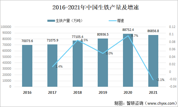2016-2021年中國(guó)生鐵產(chǎn)量及增速