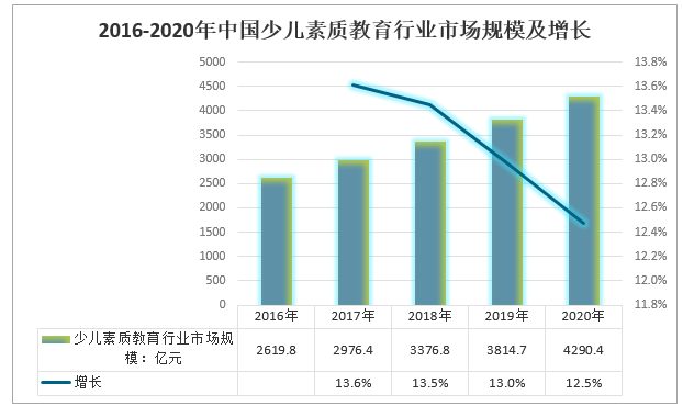 改革開放以來,中國教育發(fā)展取得令人矚目的成就,隨著社會經(jīng)濟(jì)的發(fā)展,國家教育水平的不斷提高,人們越來越關(guān)注下一代的素質(zhì)教育問題。近年來,國內(nèi)少兒素質(zhì)教育市場規(guī)模以13.1%的年復(fù)合增長率逐年增長,2020年,國內(nèi)少兒素質(zhì)教育市場規(guī)模達(dá)到4290.4億元,同比增長12.5%,呈現(xiàn)出少兒素質(zhì)教育行業(yè)穩(wěn)步上升的態(tài)勢。