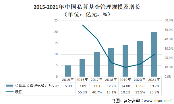 在經濟下行和內外形勢壓力下,私募基金逆勢增長,2021年中國私募基金管理規模19.78萬億元,較2020年末增加3.80萬億元,同比增長23.81%。