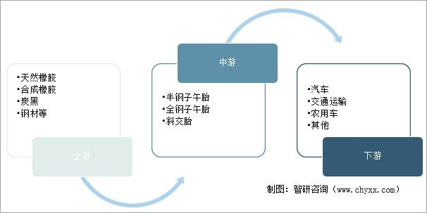 輪胎的上游是天然橡膠、合成橡膠、炭黑、鋼材等;中游是半鋼子午胎、全鋼子午胎、斜交胎的生產制造;下游應用領域是汽車、交通運輸、農用車等。輪胎產業鏈