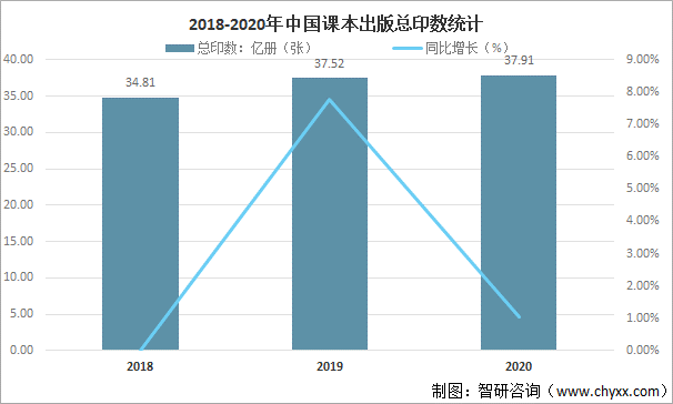 隨著中國課本出版品種數量的減少,總印數也隨之減少,2020年中國課本出版總印數為37.91億冊(張),較2019年減少了0.39億冊(張),同比減少1.04%。