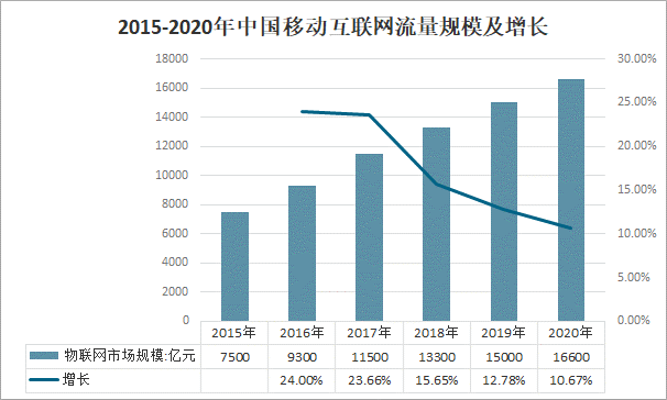 2015-2020年中國移動互聯網流量規模及增長