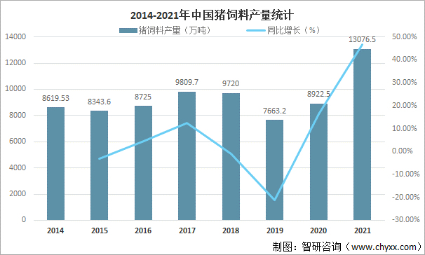 自從2015年起,中央提出要加快推進規模化,集約化的方式,我國的生豬養殖規模和數量都有了很大發展,隨著生豬養殖業的高速發展,對豬飼料的需求也不斷擴大,2021年中國豬飼料產量達13076.5萬噸,較2020年增加了4154.0萬噸,同比增長46.56%。