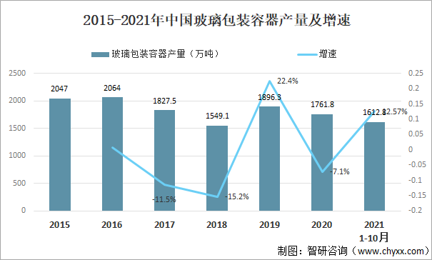2015-2021年中國玻璃包裝容器產量及增速