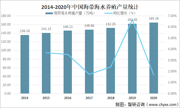 我國海岸線較長,海洋資源的開發利用具有重要的經濟價值,海帶在中國北部沿海及浙江、福建沿海大量栽培,產量居世界第一,2020年中國海帶海水養殖產量達165.16萬噸,較2019年增加了2.76萬噸,同比增長1.70%。