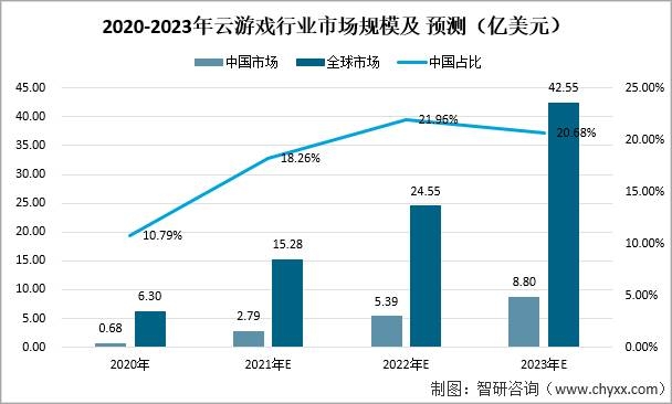 2020至2023年,中國云游戲市場規(guī)模的將持續(xù)上漲,并且中國市場培速將高于全球平均水平。2020年中國云游戲市場規(guī)模為0.26億美元,占全球云游戲規(guī)模比例為10.79%。預計到2023年,中國云游戲市場規(guī)模為8.80億美元,全球云游戲市場規(guī)模為42.55億美元,中國將占比20.68%。