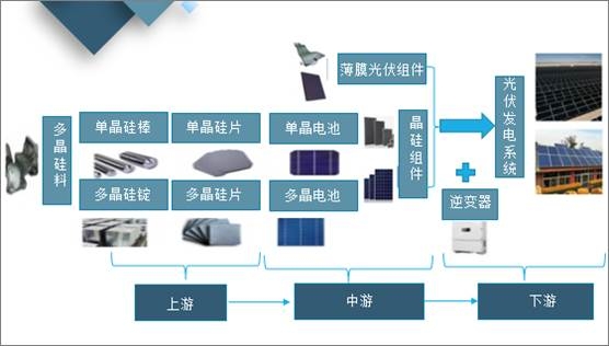 光伏產業(yè)鏈包括硅料、鑄錠(拉棒)、切片、電池片、電池組件、應用系統(tǒng)等6個環(huán)節(jié)。上游為硅料、硅片環(huán)節(jié);中游為電池片、電池組件環(huán)節(jié);下游為應用系統(tǒng)環(huán)節(jié)。光伏產業(yè)鏈