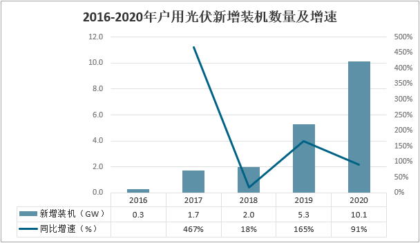 2016-2020年戶用光伏新增裝機數(shù)量及增速