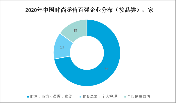在2021年9月8日中國連鎖經營協會發布的《2020年中國時尚零售百強榜單》中,服裝、服飾、鞋履、家紡企業總計72家,占比最大;護膚美妝、個人護理總計13家;金銀珠寶首飾總計15。