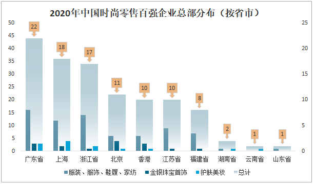 從時尚零售百強總部所在地的分布看,時尚消費品的產業集聚效應一如從前,地區集中度依然居高,將近六成企業總部在粵、滬、浙;京、港、蘇、閩分別有十家左右企業選擇將總部設立于此。