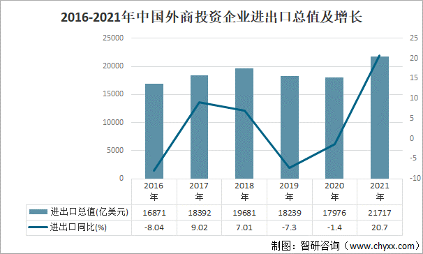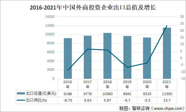 2020年,中國外商投資企業出口總值9323億美元,出口同比下降3.5%;2021年,中國外商投資企業出口總值11530億美元,出口同比增長23.7%。