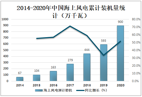 隨著陸地上的優質資源逐漸被開發利用,人類開始轉向面積更廣、資源更為豐富的海洋,海上風力發電成為關注焦點。海面平坦,風速一般較大,且海上建設風電場可以降低土地使用費。更為重要的是,沿海地區多為人類生活密集區域,用電負荷高,有利于海上發電就近消納、棄風風險低這些都是海上風電在全球范圍內快速發展并被普遍看好的重要原因。2020年中國海上風電累計裝機量達900萬千瓦,較2019年增加了307萬千瓦,同比增長51.8%,未來將繼續保持增長趨勢。