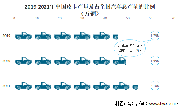 2019-2021年中國皮卡產(chǎn)量及占全國汽車總產(chǎn)量的比例