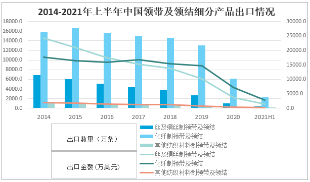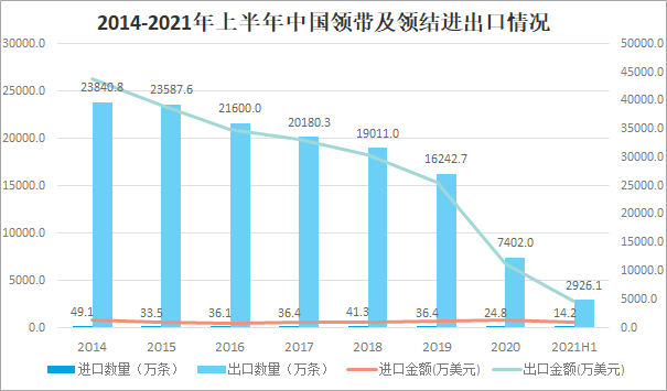 2014-2021年上半年中國領帶及領結細分產品出口情況