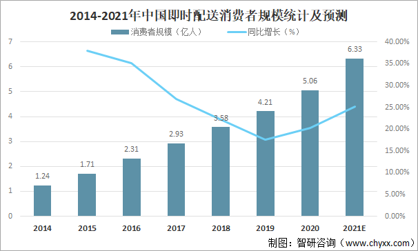隨著外賣、新零售的進一步布局,即時配送的品類不斷增多,消費者對于即時配送的需求也在快速增長,即時配送的發展迎來了黃金時期,隨著消費需求增長,用戶數量也快速增加,2020年中國即時配送消費者規模達5.06億人,較2019年增加了0.85億人,同比增長20.19,未來將繼續保持增長,預計2021年中國即時配送消費者規模將達到6.33億人。