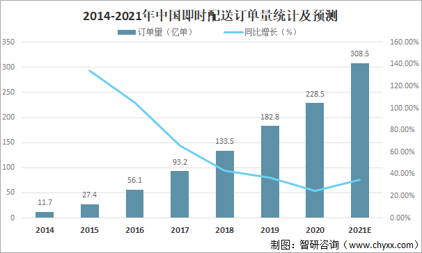隨著消費者規模的不斷增長,市場規模也持續擴大,2020年中國即時配送訂單量達228.5億單,較2019年增加了45.70億單,同比增長25.00%,近年來即時配送行業從快速增長期逐步進入成熟發展期,市場規模增速趨于穩定,即時配送依靠其端到端、及時性的服務,使得商品價值更快實現,消費者獲得極好的購物體驗,而一二線居民快節奏、高收入、高水平的生活愿意為此種消費買單,未來中國即時配送市場將繼續保持增長,預計2021年中國即時配送訂單量將達到308.5億單。
