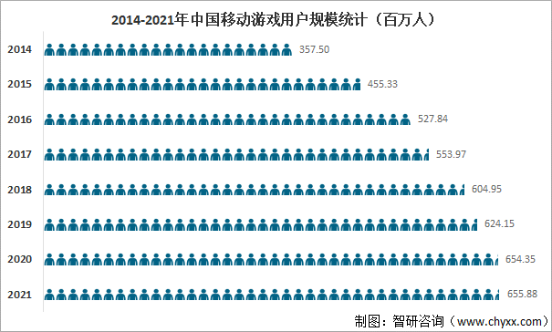 隨著智能手機(jī)廣泛普及以及移動互聯(lián)網(wǎng)的不斷發(fā)展,中國移動游戲用戶規(guī)模快速增長,2021年中國移動游戲用戶規(guī)模達(dá)655.88百萬人,較2020年增加了1.53百萬人,同比增長0.23%,2021年中國移動游戲用戶規(guī)模持續(xù)上升,但也受到人口結(jié)構(gòu)變化影響規(guī)模容量趨于飽和,具體原因主要是因為防沉迷新規(guī)落地,未成年人保護(hù)收獲實(shí)效,用戶結(jié)構(gòu)趨向健康合理。2014-2021年中國移動游戲用戶規(guī)模統(tǒng)計