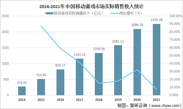 2014-2021年中國移動游戲市場實(shí)際銷售收入統(tǒng)計