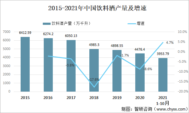 從國家統計局數據來看,2015-2021年中國飲料酒呈下降走勢,其中2021年1-10月中國飲料酒產量為3953.79萬千升,同比增長4.7%。