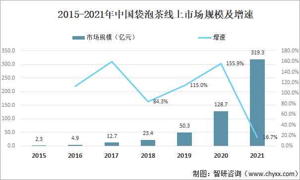 中國飲茶文化盛行,因而茶葉消費者用戶比較高,而袋泡茶是對傳統茶葉的創新,隨著電商的發展,線上袋泡茶銷售數量逐年增加,其中2021年中國袋泡茶線上市場規模為319.3億元,同比增長16.7%.