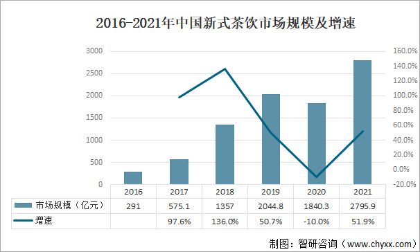 隨著我國消費者消費能力的提升,人們對飲品口感要求不斷提高,現制茶飲相較于傳統茶飲口感更好、選擇更加豐富因為備受消費者青睞。也隨著新式茶飲的發展,也促進袋泡茶的發展。2021年中國新式茶飲市場規模約為2795.9億元,同比增長51.9%。