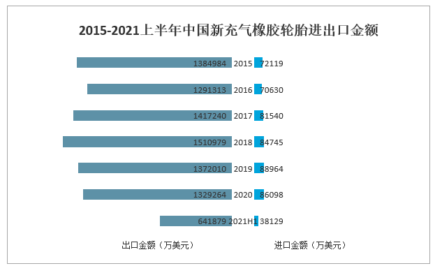 中國為橡膠輪胎出口大國之一,2021上半年中國新充氣橡膠輪胎出口金額為641879萬美元;新充氣橡膠輪胎進口金額為38129萬美元。