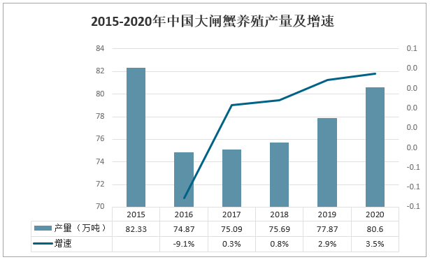 2020年中國大閘蟹養殖產量約為80.6萬噸,同比增長3.5%。