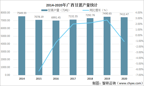 隨著2020年廣西甘蔗播種面積的減少,產量也隨之減少,2020年廣西甘蔗產量為7412.47萬噸,較2019年減少了78.18萬噸,同比減少1.04%。