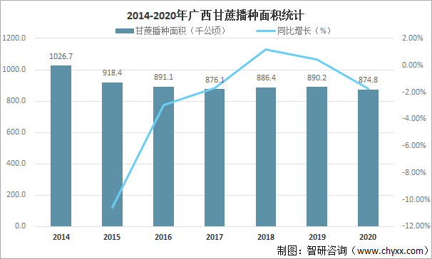 廣西壯族自治區是我國南部沿海地區,光照充足、雨量充沛、氣溫相對較高且無霜期長,因此極適宜甘蔗生產,蔗糖產業是廣西壯族自治區的支柱型產業,是當地重要的財政來源,其發展直接關系著廣西壯族自治區千萬蔗農的生計,2020年廣西甘蔗播種面積為874.8千公頃,較2019年減少了15.40千公頃,同比減少1.73%。2014-2020年廣西甘蔗播種面積統計