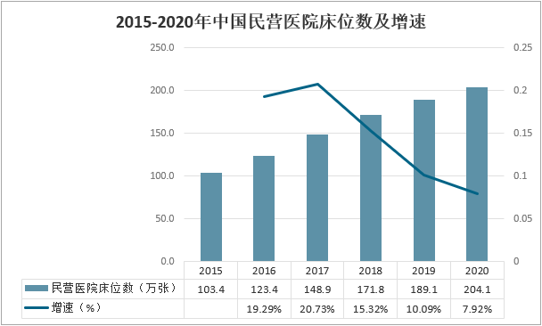 2015-2020年中國民營醫院床位數及增速