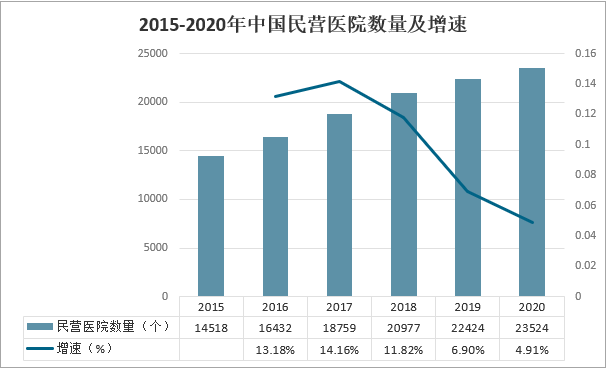 隨著我國經濟迅速發展,國家鼓勵社會辦醫,民營醫院呈現迅速增加趨勢,民營醫院的醫療服務能力有了較大的提升,提供的醫療服務量大幅度的增長。截至2020年底,全國共有民營醫院23524個,較上年增加1100個,同比增長4.91%。2015-2020年中國民營醫院數量及增速