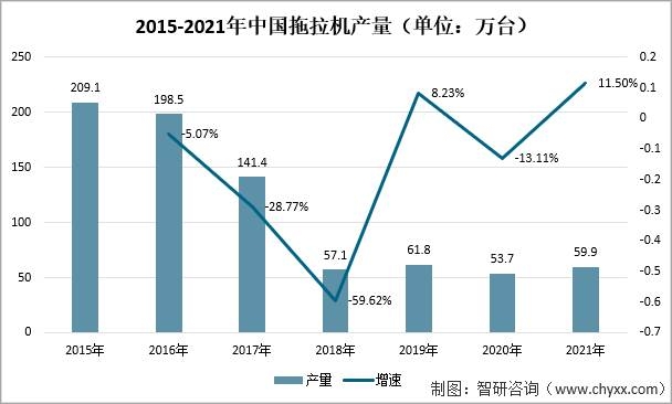 拖拉機是一種用途非常廣泛的農業機械,2019-2021年我國拖拉機產量相對2017年之前產量減少較大。2021中國拖拉機產量為59.9萬臺,同比增漲11.50%,產量有所回升。