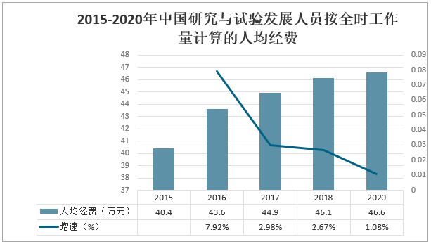 根據國家統計局數據,2015-2020年中國研究與試驗發展人員按全時工作量計算的人均經費持續增長,但近來增速有所放緩。2020年按研究與試驗發展(R&D)人員全時工作量計算的人均經費為46.6萬元,比上年增加0.5萬元。