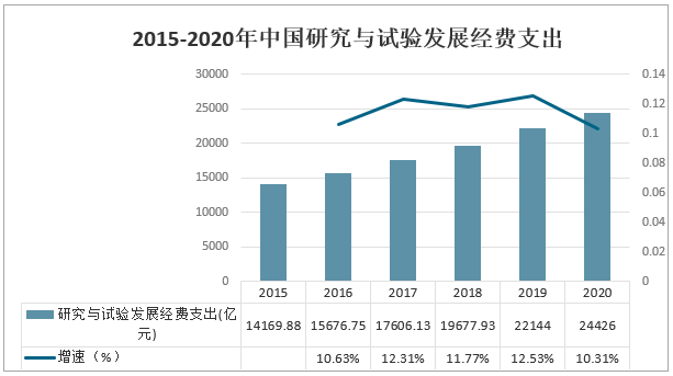 2020年,全國研究與試驗發展(R&D)經費支出24426億元,比上年增加2282億元,同比增長10.31%,延續了“十三五”以來兩位數以上增長態勢,但受新冠肺炎疫情等因素影響,增速比上年回落2.22個百分點。2015-2020年中國研究與試驗發展經費支出
