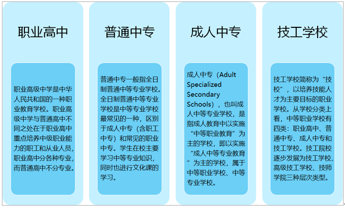 中等職業學校是指經政府有關部門依法批準設立,實施全日制中等學歷教育的各類職業學校,招生對象是初中畢業生和具有與初中同等學歷的人員,基本學制為三年,學生畢業屬中職學歷。中等職業學校在對學生進行高中程度文化知識教育的同時,根據職業崗位的要求有針對性地實施職業知識與職業技能教育。分為公辦和民辦兩大類。中等職業學校有四類:職業高中、普通中專、成人中專和技工學校,技工院校逐步發展為技工學校、高級技工學校、技師學院三種層次類型。其中,技工學校(技師學院)歸人社部門管理,職業高中、普通中專和成人中專歸教育部門管理。