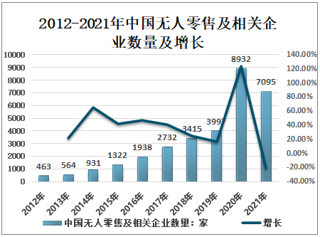 2012-2021年中國無人零售及相關企業數量及增長