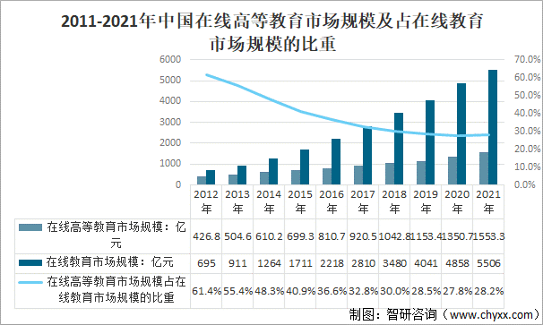 2011-2019年中國在線教育市場規模呈逐年增長趨勢,后疫情時代,受政策支持和5g、AI等技術發展的正向影響,中國在線教育市場規模進一步擴大。2020年中國在線教育市場規模4858億元,在線高等教育市場規模1350.7億元,在線高等教育市場規模占在線教育市場規模的27.80%;2021年中國在線教育市場規模5506億元,在線高等教育市場規模約1553.3億元,在線高等教育市場規模占在線教育市場規模的28.21%。