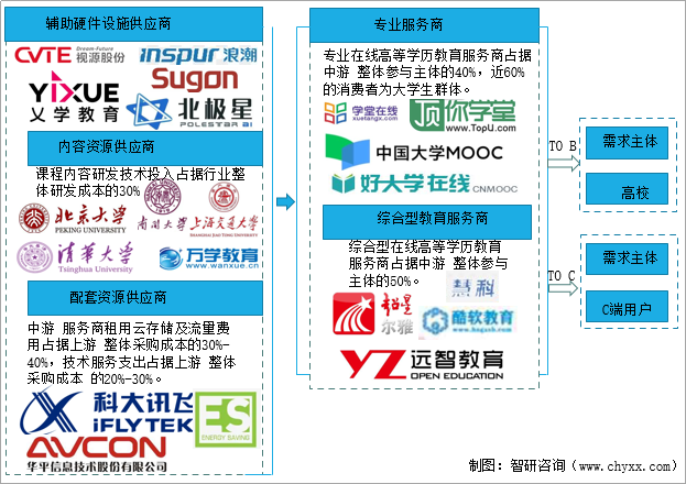 中國在線高等學歷教育行業上游市場參與主體為輔助硬件設施供應商、內容資源供應商及配套資源供應商,為中游在線高等學歷教育服務商提供輔助硬件、內容資源及配套服務。中國在線高等學歷教育行業中游市場參與主體包括專業在線高等學歷教育服務商、綜合型在線高等學歷教育服務商,為下游需求主體提供在線高等學歷教育產品及服務。中國在線高等學歷教育行業下游需求主體包括高校B端用戶,在校大學生及其他學歷需求者等C端用戶。中國在線高等學歷教育行業產業鏈